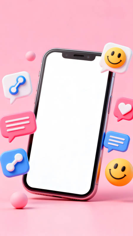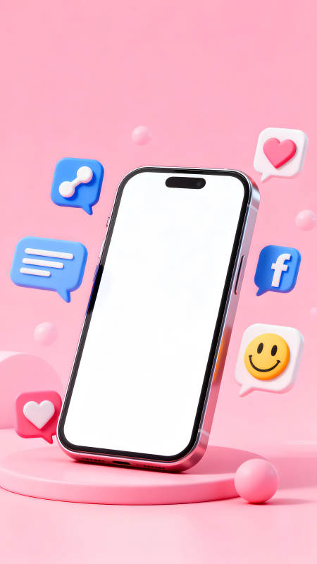 手机社交媒体图标环绕粉色背景