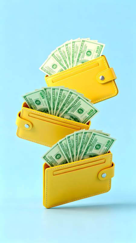 钱包与百元钞票悬浮展示