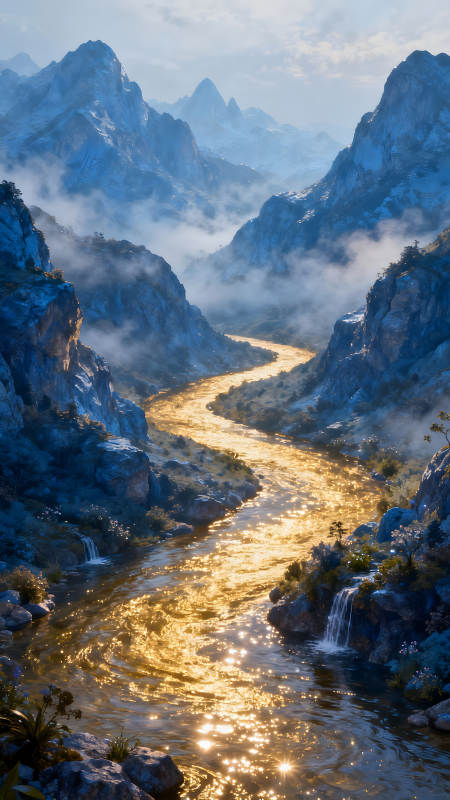 金光闪耀的山谷河流风光