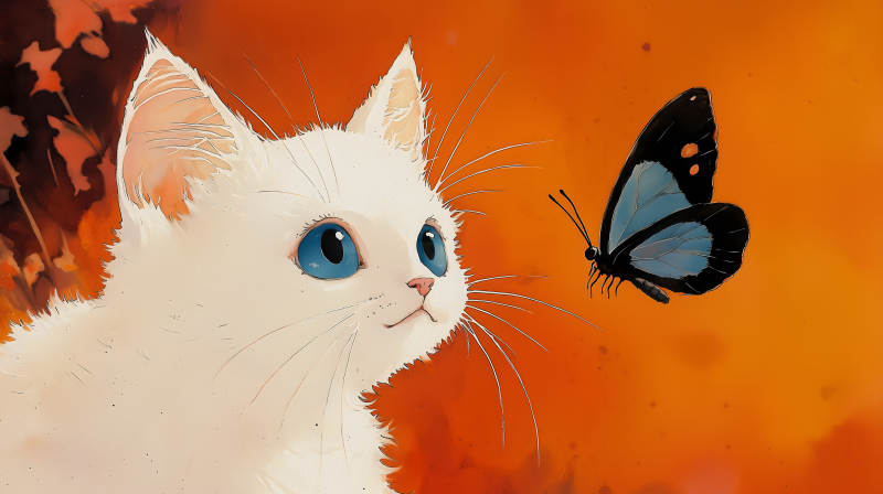 好奇的小白猫与蝴蝶