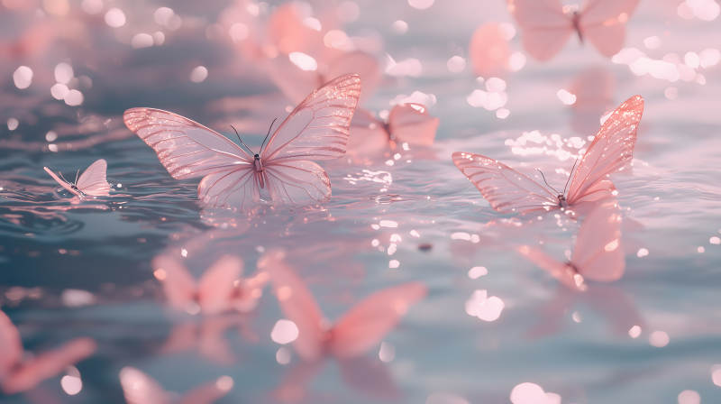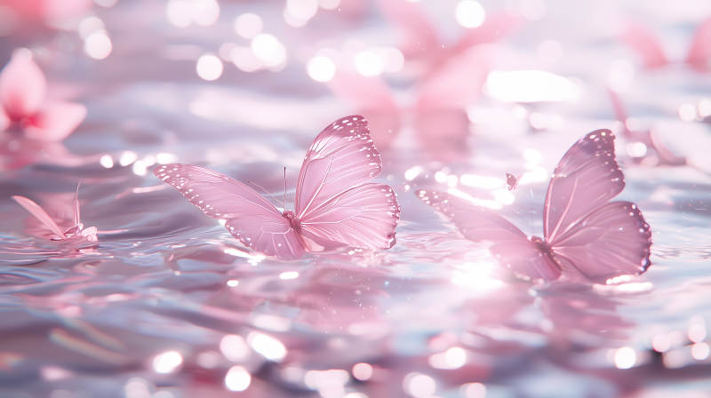 粉色蝴蝶与波光粼粼的水面