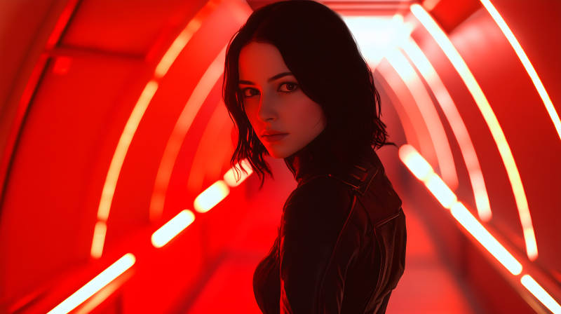霓虹红光下的女子