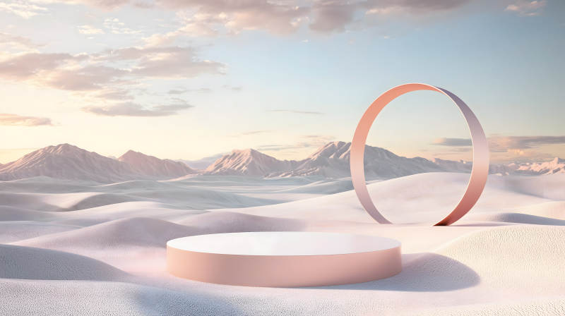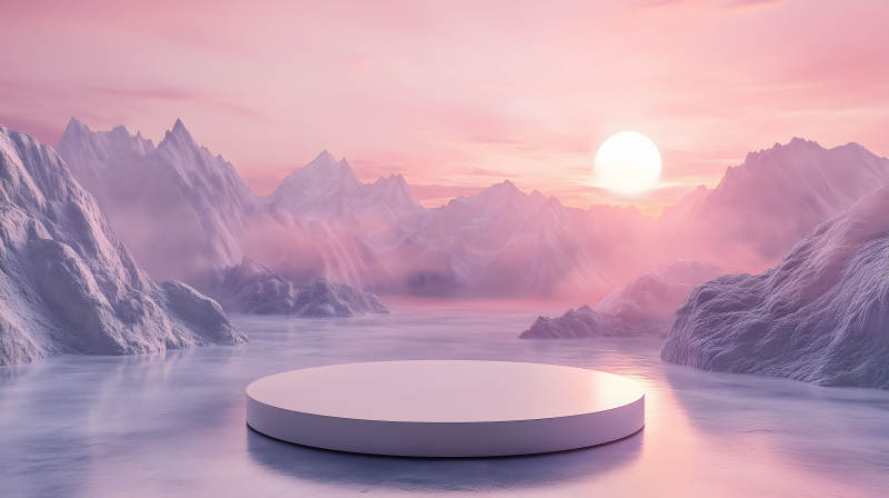 梦幻雪山日落下的圆形展台
