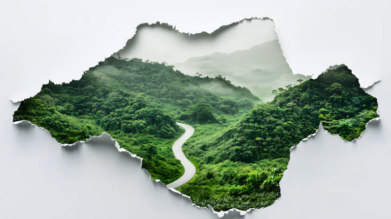 撕裂的纸张与绿色山路