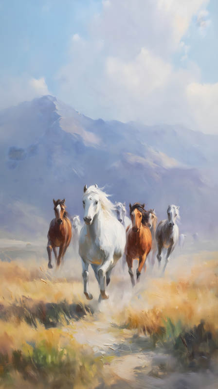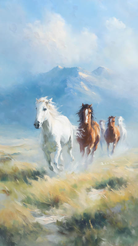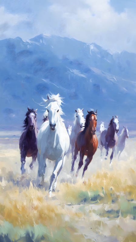 奔腾的野马与雪山