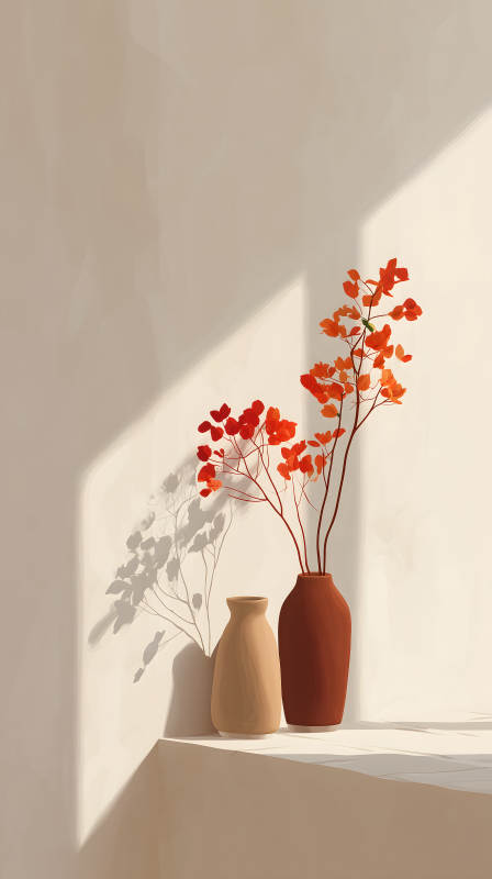 阳光下的陶罐与红花