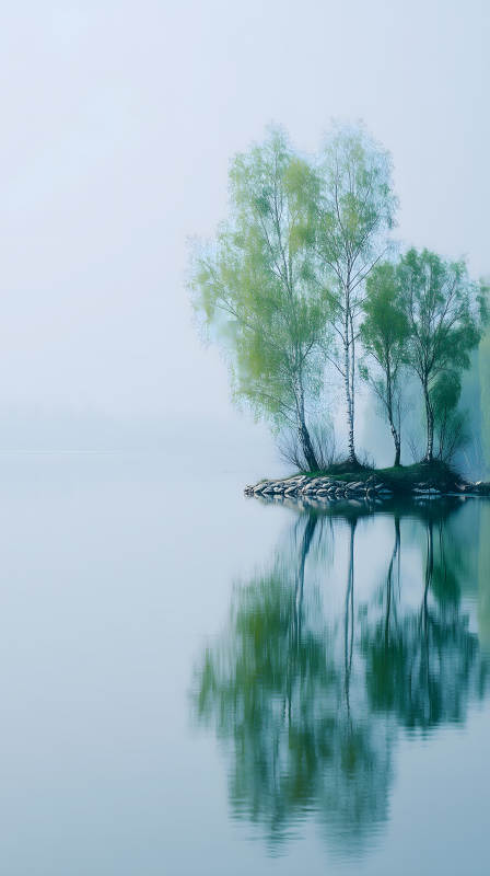 湖畔孤岛树影婆娑倒影