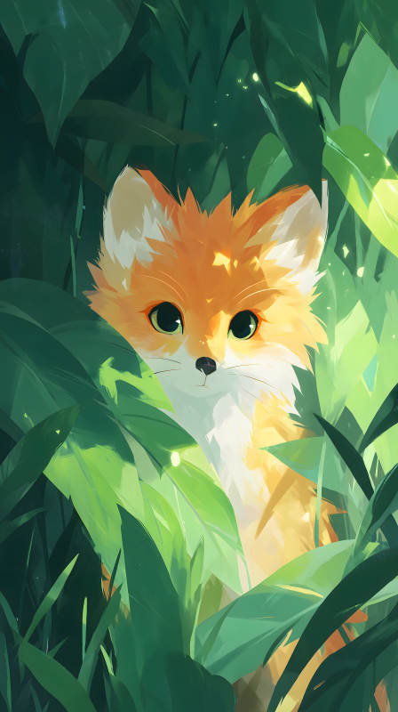 小狐狸躲在树叶里眼神清澈