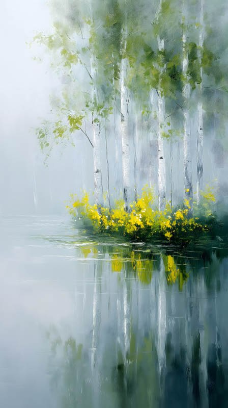 湖畔白桦林倒影油画风景