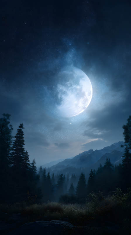 夜幕下的山脉森林与明月