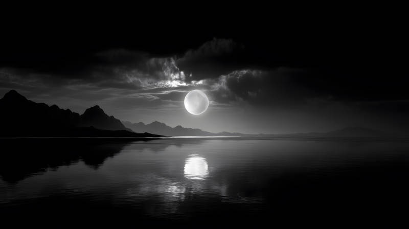夜空皓月倒影平静湖面