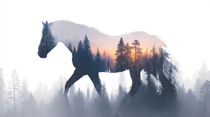 马与森林剪影交织的唯美意境