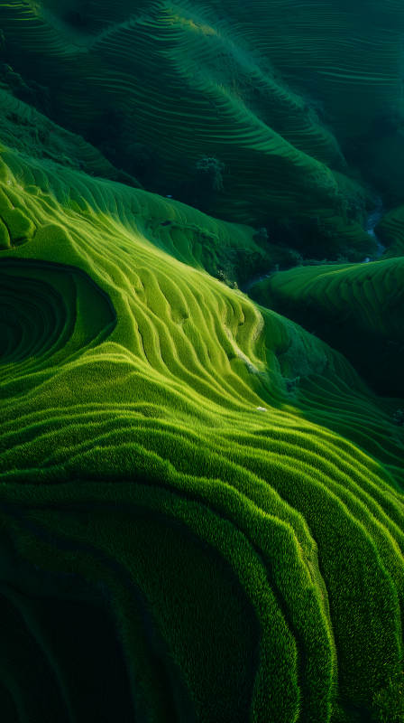 翠绿梯田山峦晨曦光影交织