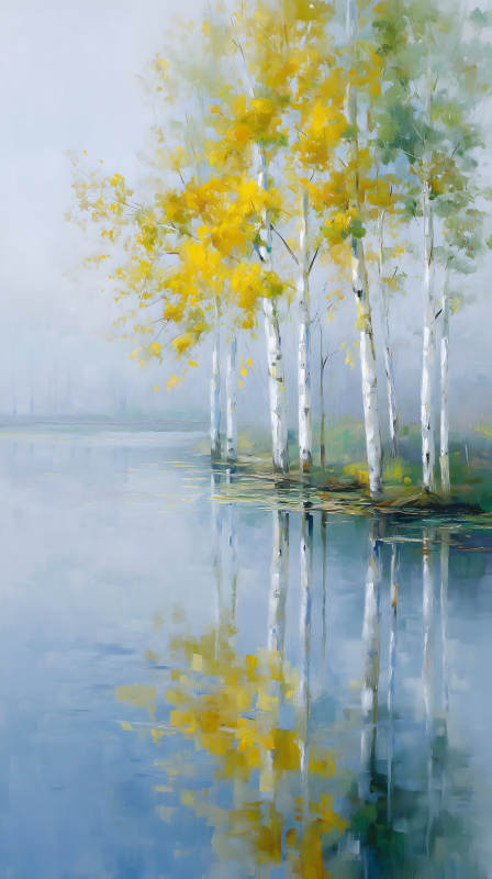 秋日湖畔白桦林油画