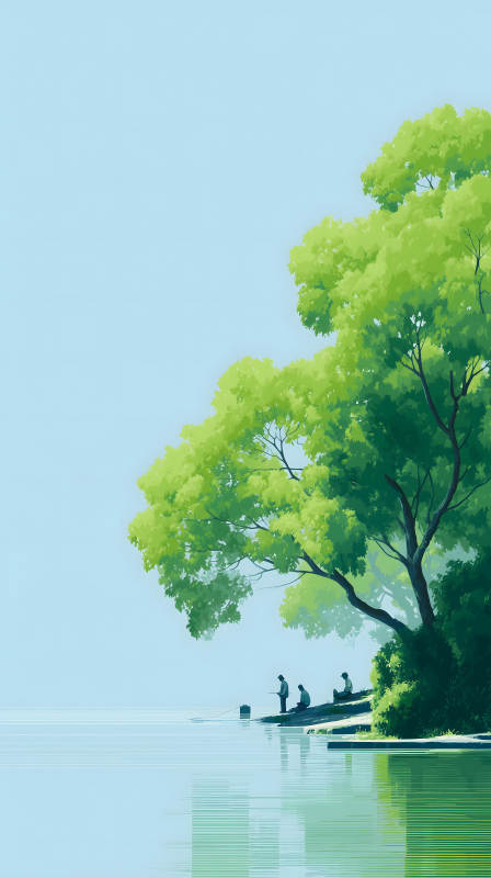 湖边钓鱼树木葱茏风景优美
