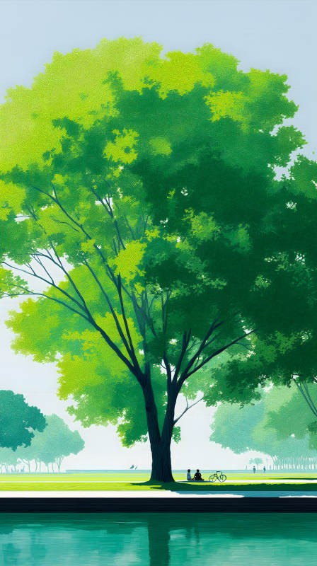 阳光下的公园树木与湖水倒影