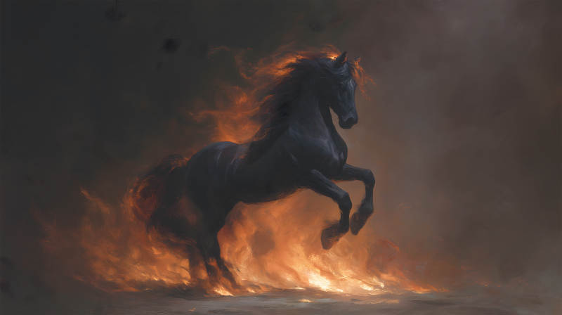 火焰奔腾的黑色骏马翱翔于黑暗中