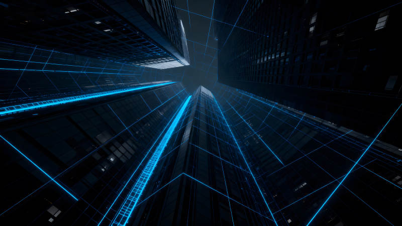 夜幕下摩天大楼的科幻视角