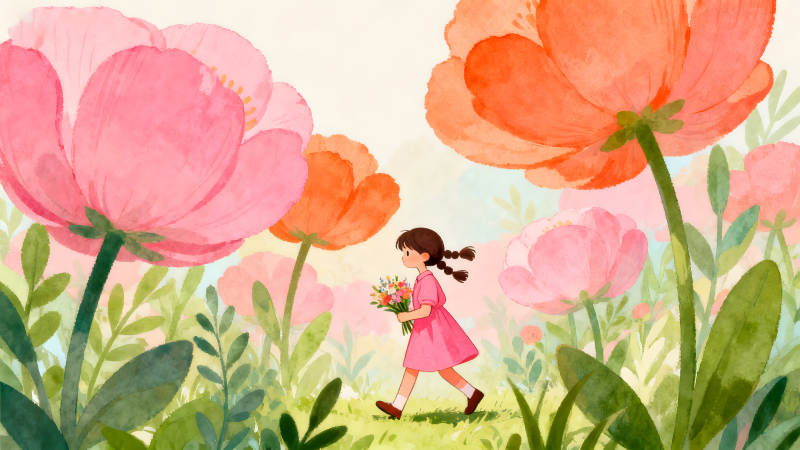 女孩花丛中漫步