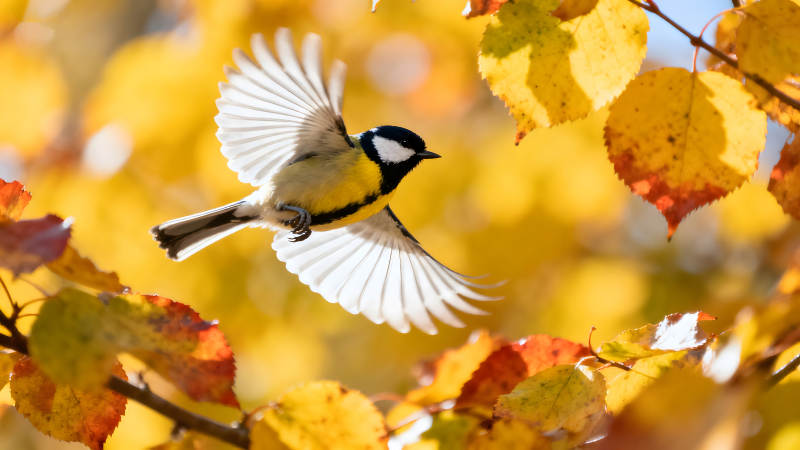 秋叶中飞翔的鸟儿