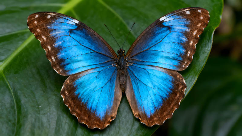 蓝色蝴蝶展开翅膀栖息在绿叶上