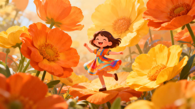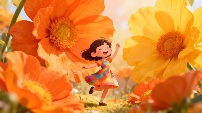 女孩在花海中欢快奔跑