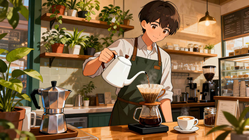 咖啡店员制作咖啡动漫风格