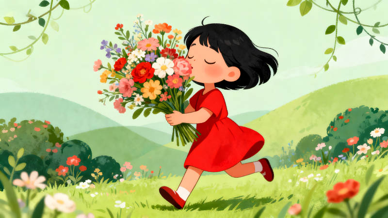 女孩拥抱鲜花奔跑