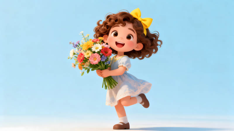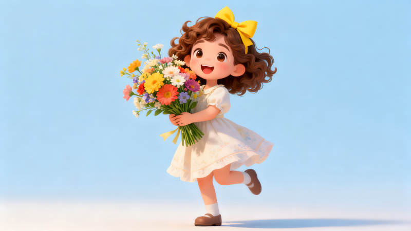 可爱女孩手捧鲜花在蓝天背景下开心奔跑
