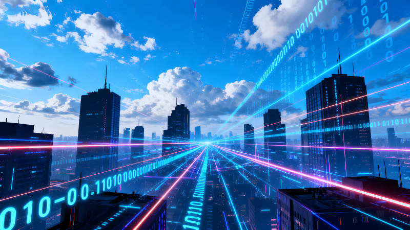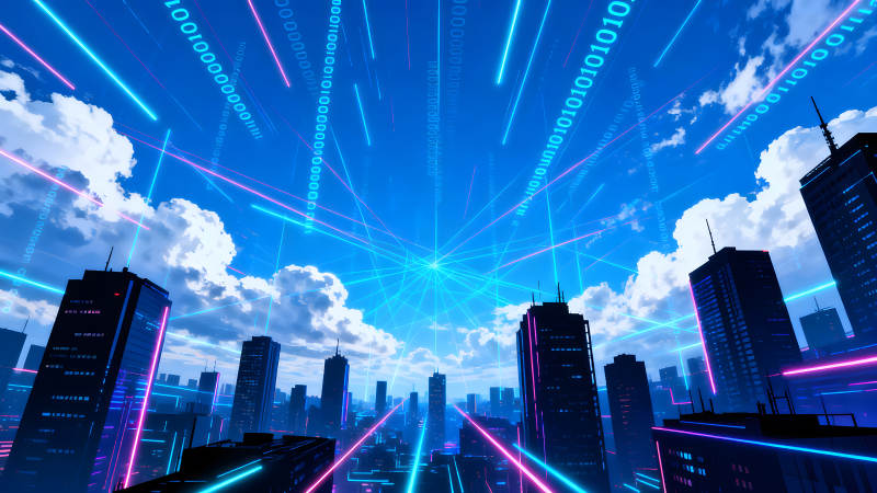 赛博朋克城市天空中的数据流