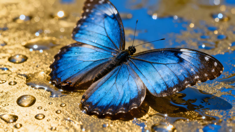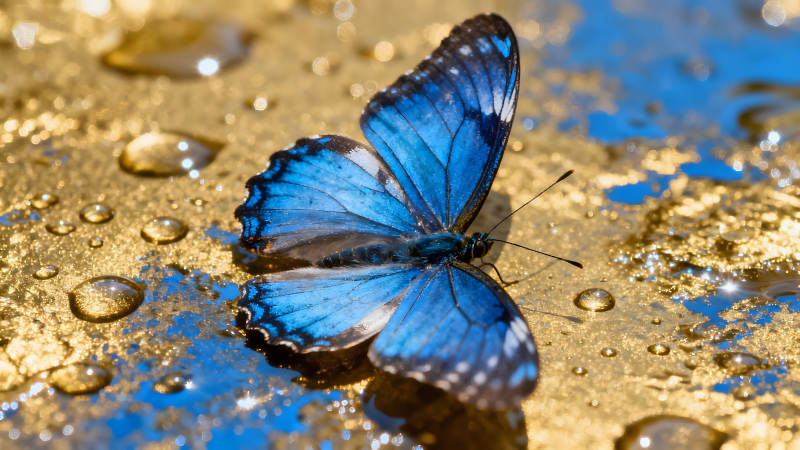 蓝色蝴蝶栖息金黄表面水珠环绕