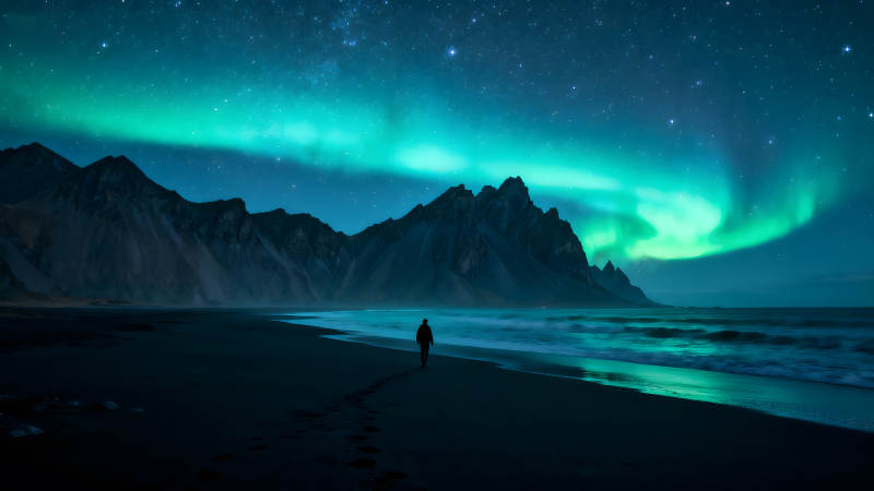 极光下的海滩剪影孤独前行