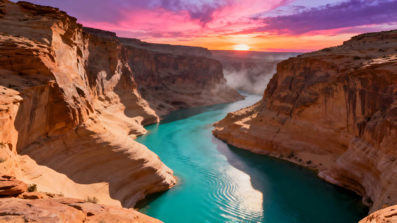 峡谷日落蓝水色彩绚丽