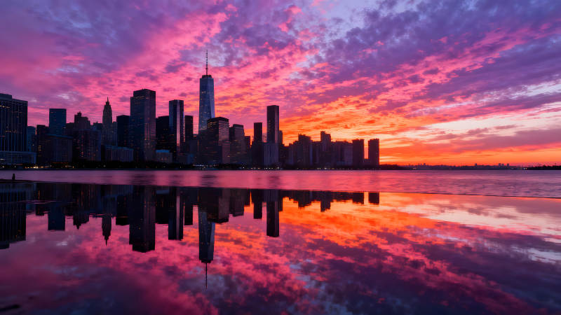 纽约市中心日落美景与水面倒影