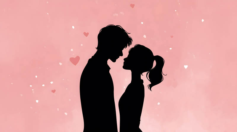 情侣剪影相拥粉色背景爱心点缀