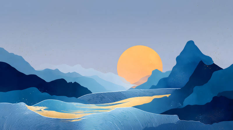 蓝调山水日出图