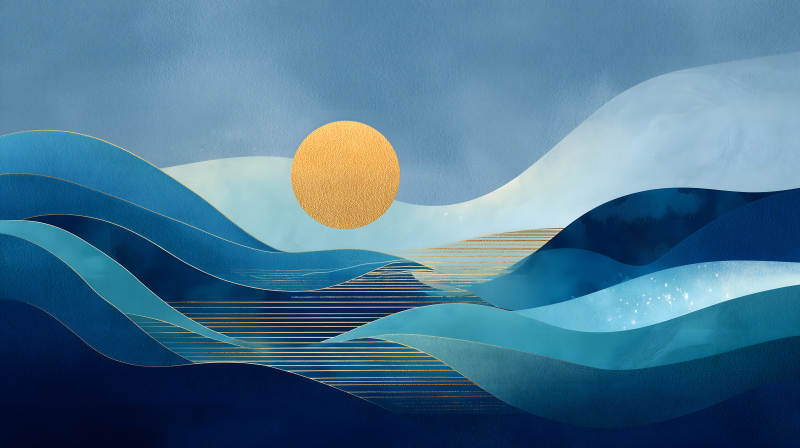 抽象蓝调山水画太阳点缀