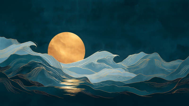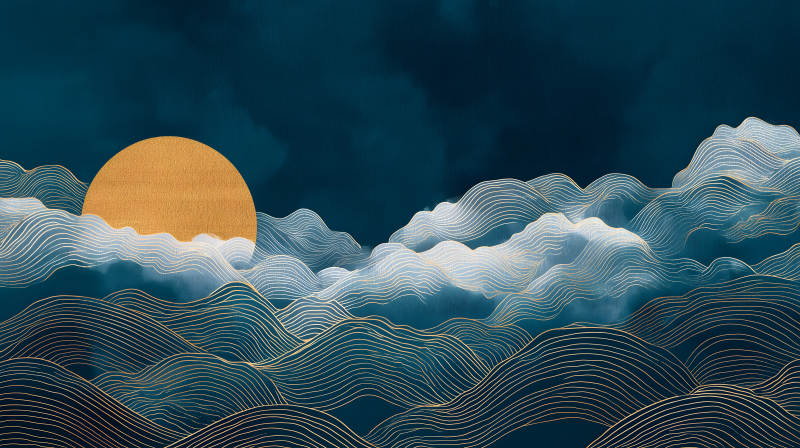 日出海浪金线绘青色幽静
