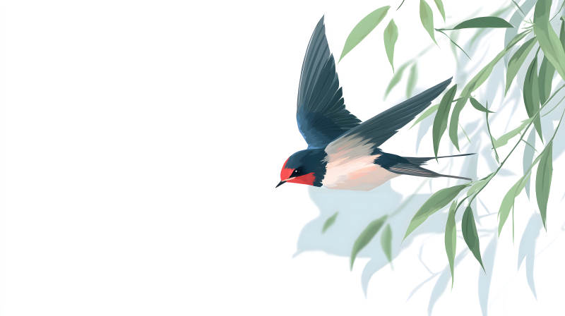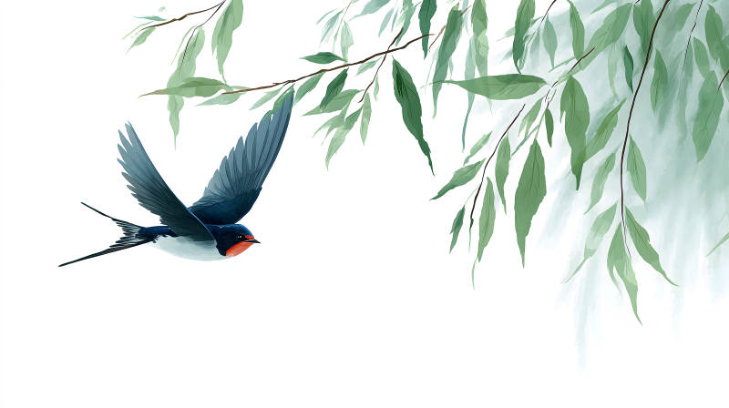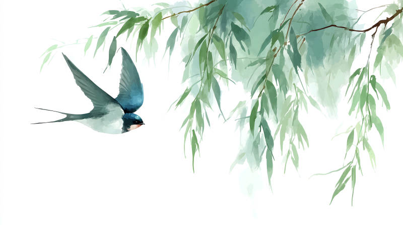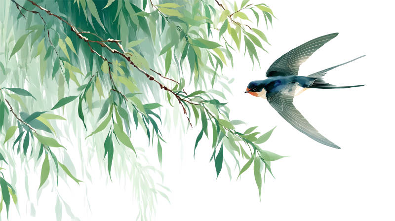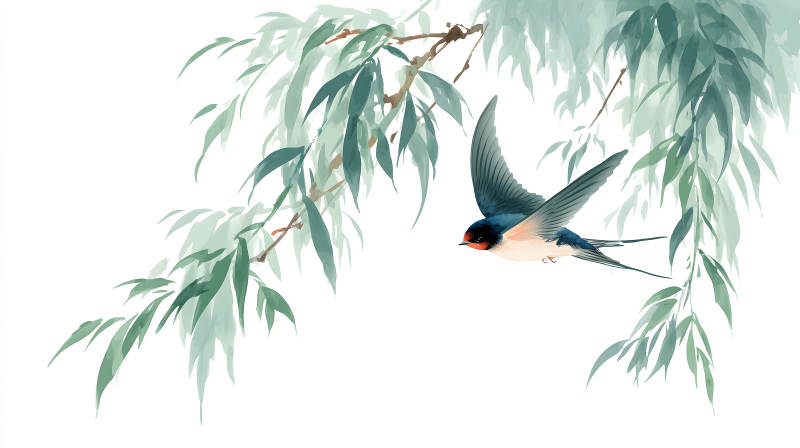 翠绿柳枝与飞翔燕子图