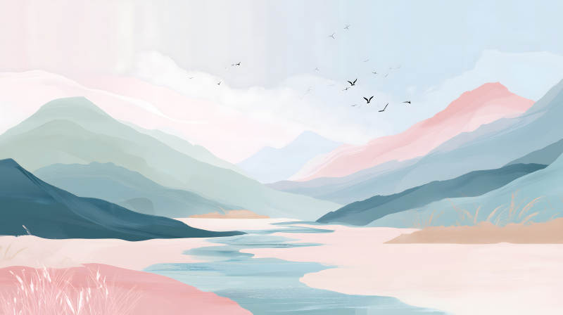 水墨山河鸟飞翔唯美风景画
