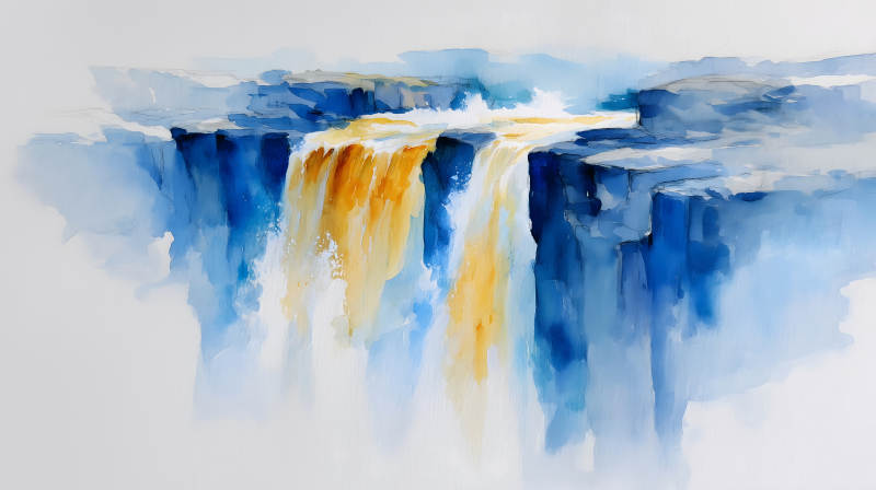 瀑布水彩画蓝色与金色