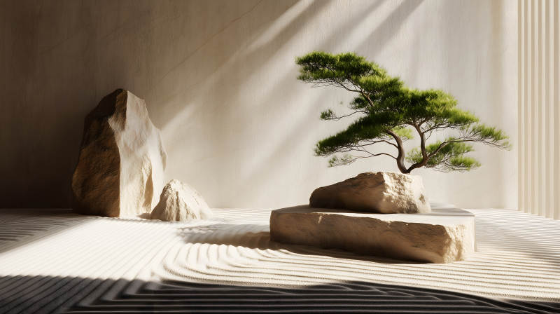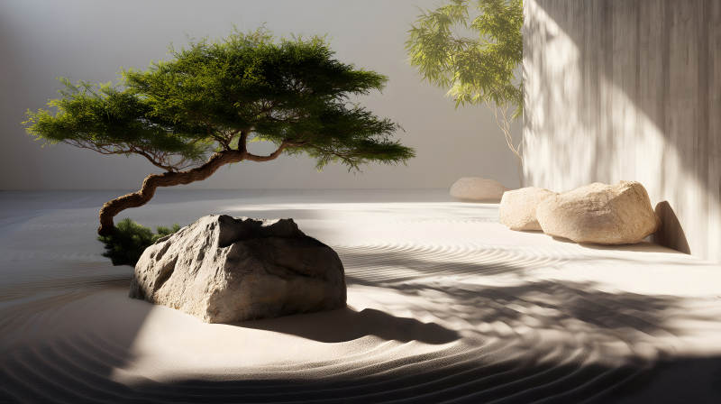 禅意风格景观树石砂砾光影交织