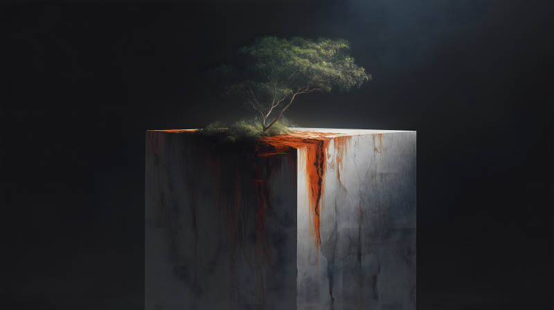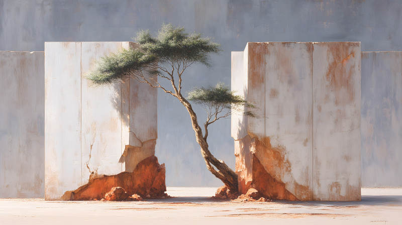 水泥块中生长着一棵树木