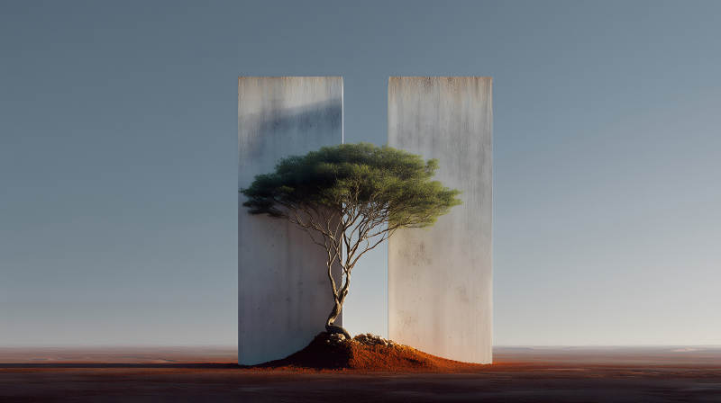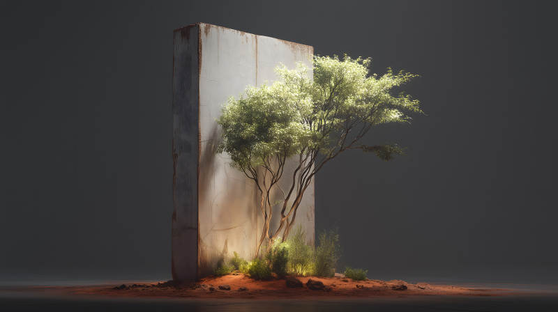 树木与混凝土墙在沙漠中