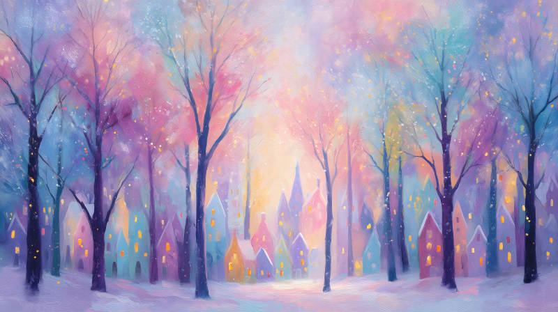 冬日梦幻雪景小镇油画