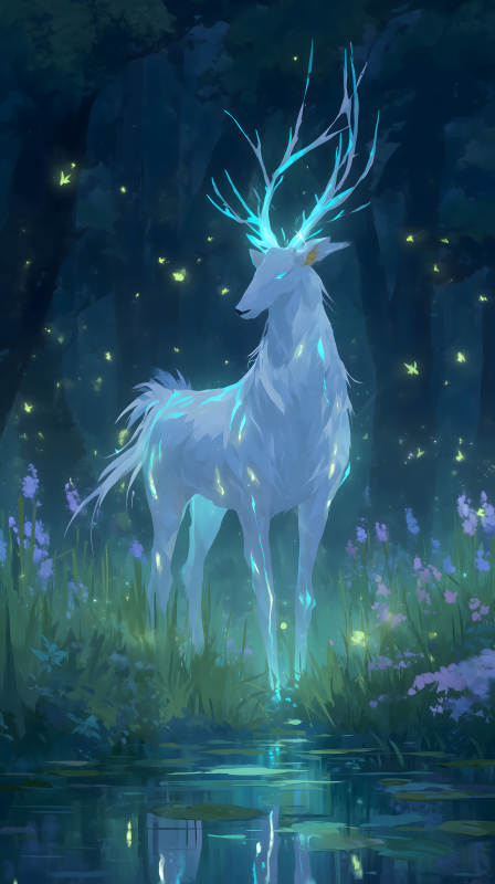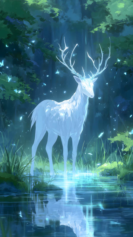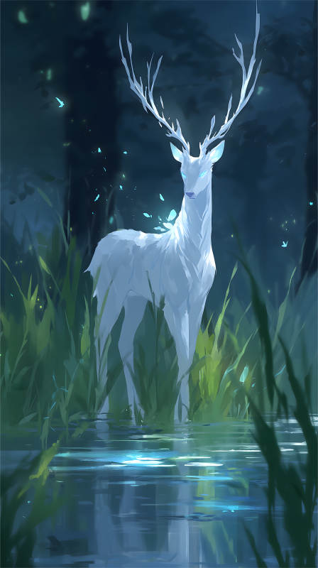 发光白鹿伫立水面森林