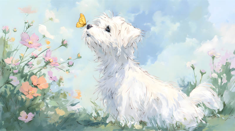 小狗与蝴蝶相遇在花海中