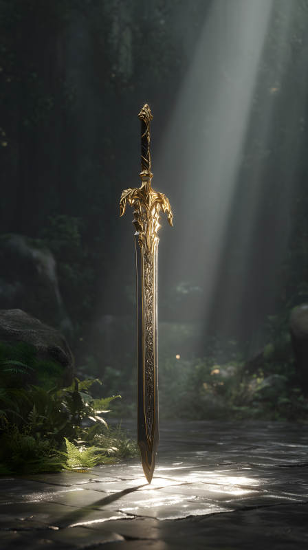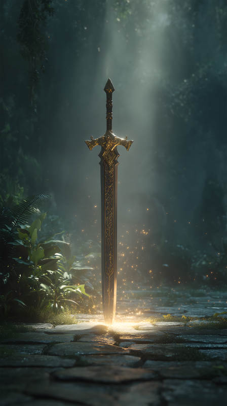 金色宝剑伫立于森林之中