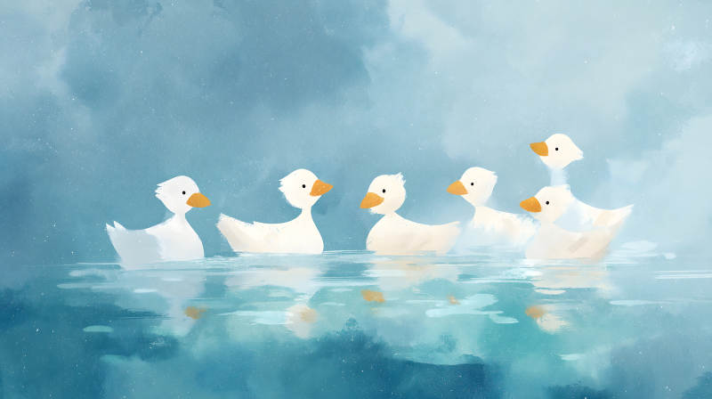 五只小鸭在水上嬉戏