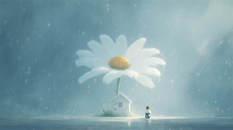雨中童书与巨型雏菊的奇幻景象